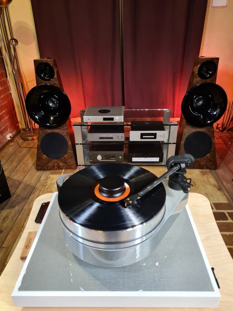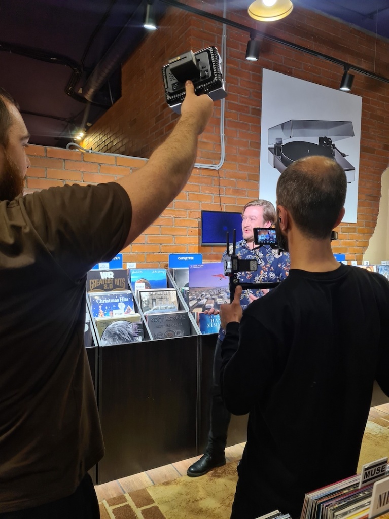 В эфире было задействовано сразу 4 зоны пространства шоу-рума, съемка велась на несколько статичных и камер в движении. Динамику придавали не только сменяющиеся форматы и кадры, но и аудио-видео паузы — Виктор Горбатов презентовал пару редких пластинок, а организаторы вывели сигнал с референсной системы прямо на мастер-канал пульта оператора трансляции. Это конечно не тот способ, как стоит слушать винил, но качество даже такого вещания получилось на уровне. В том числе благодаря компонентам системы — проигрыватель винила Pro-Ject RPM 10 Carbon со звукоснимателем Ortofon MC Cadenza Bronze в связке с фонокорректором Pro-Ject Phono Box RS2 суммарной стоимостью в 740 000 рублей.