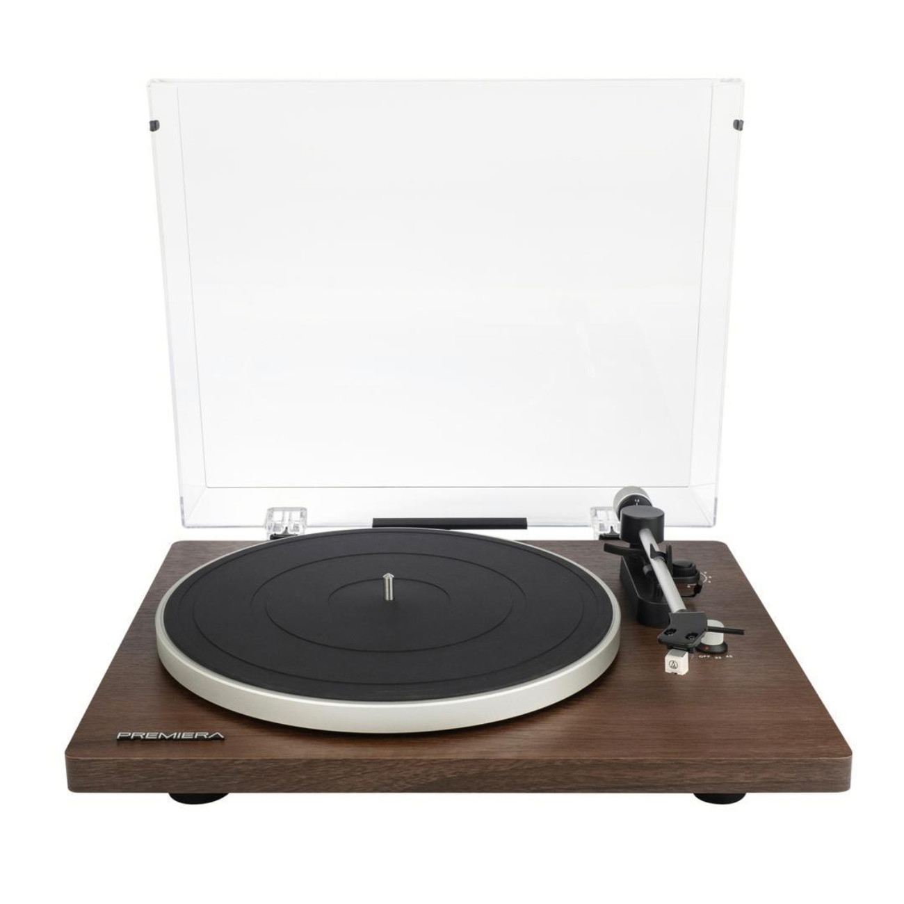На проигрыватель устанавливают 9-дюймовый алюминиевый тонарм с ручным управлением. Плавное опускание и подъем тонарма обеспечивает демпфированный микролифт. На тонарм монтируют MM-звукосниматель Audio-Technica AT3600L, положение которого тщательно настраивают на фабрике. Благодаря этому проигрыватель Premiera ECO One готов к работе практически сразу после распаковки.